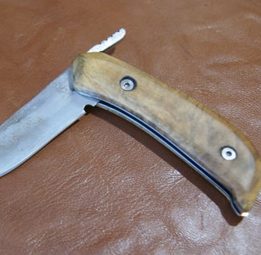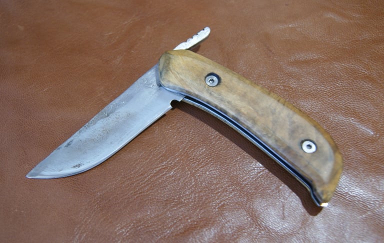 Assemblage des différentes pièces du couteau pliant, création du manche en bois, pose du manche sur le couteau